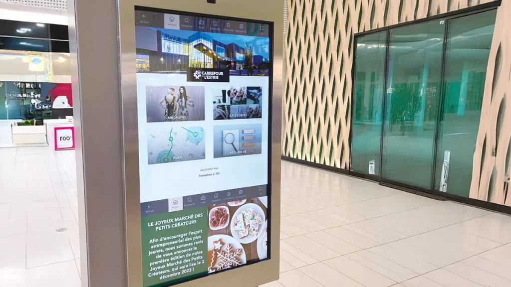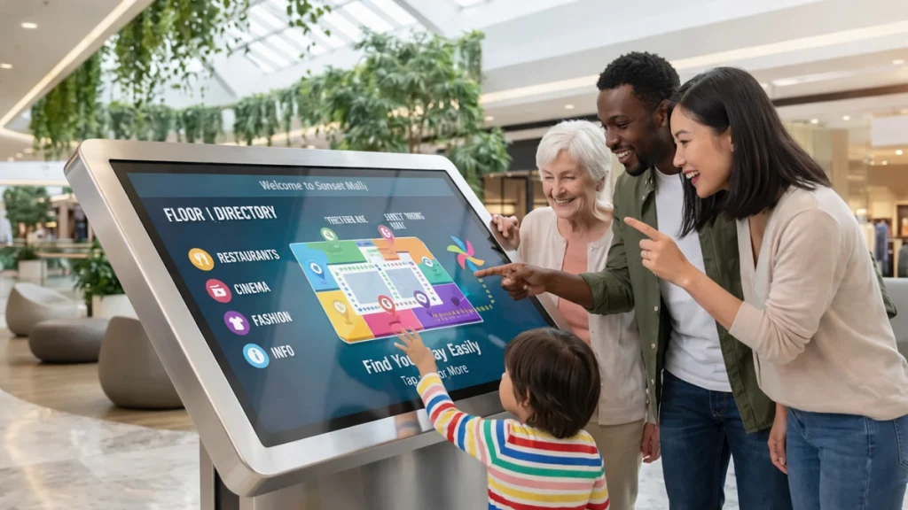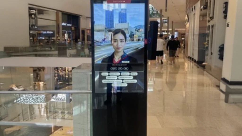 An AI concierge display can help visitors find stores, recommend services, or provide event information instantly.