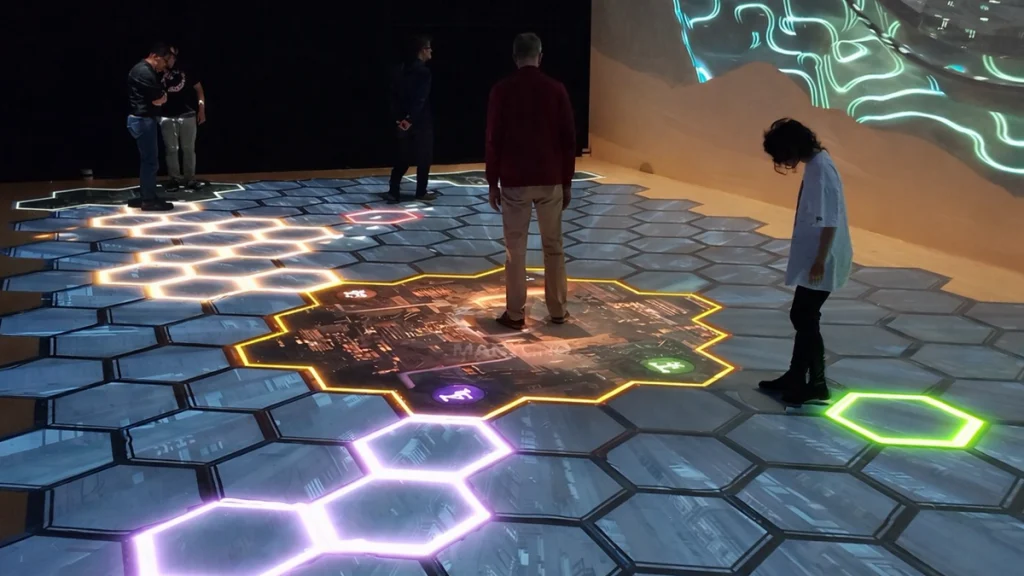 Instead of a single screen, an entire wall becomes a responsive interface where users can interact with visuals through touch or movement.