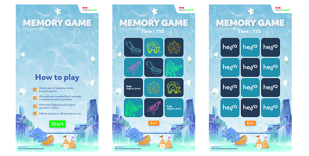 Memory Game is a fast-paced memory challenge designed to test players’ focus and recall skills. At the start of the game, all cards are briefly revealed to allow players to memorize their positions. Once the cards are flipped face down, players must match pairs of identical cards before the time runs out. Each correct match earns points, while incorrect guesses will flip the cards back over. The goal is to clear all pairs within the time limit to win. This game is simple, engaging, and suitable for players of all ages making it perfect for events, brand activations, and interactive kiosk experiences.